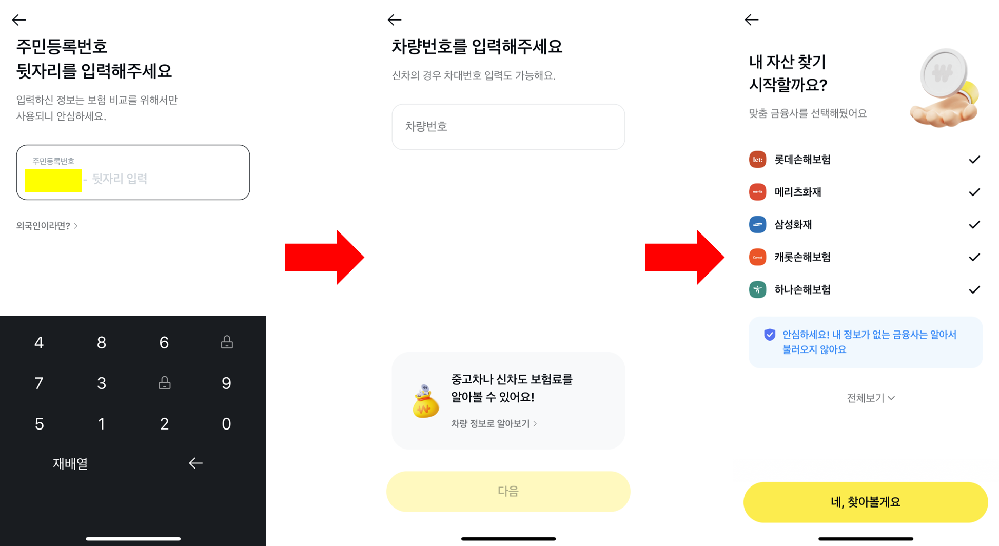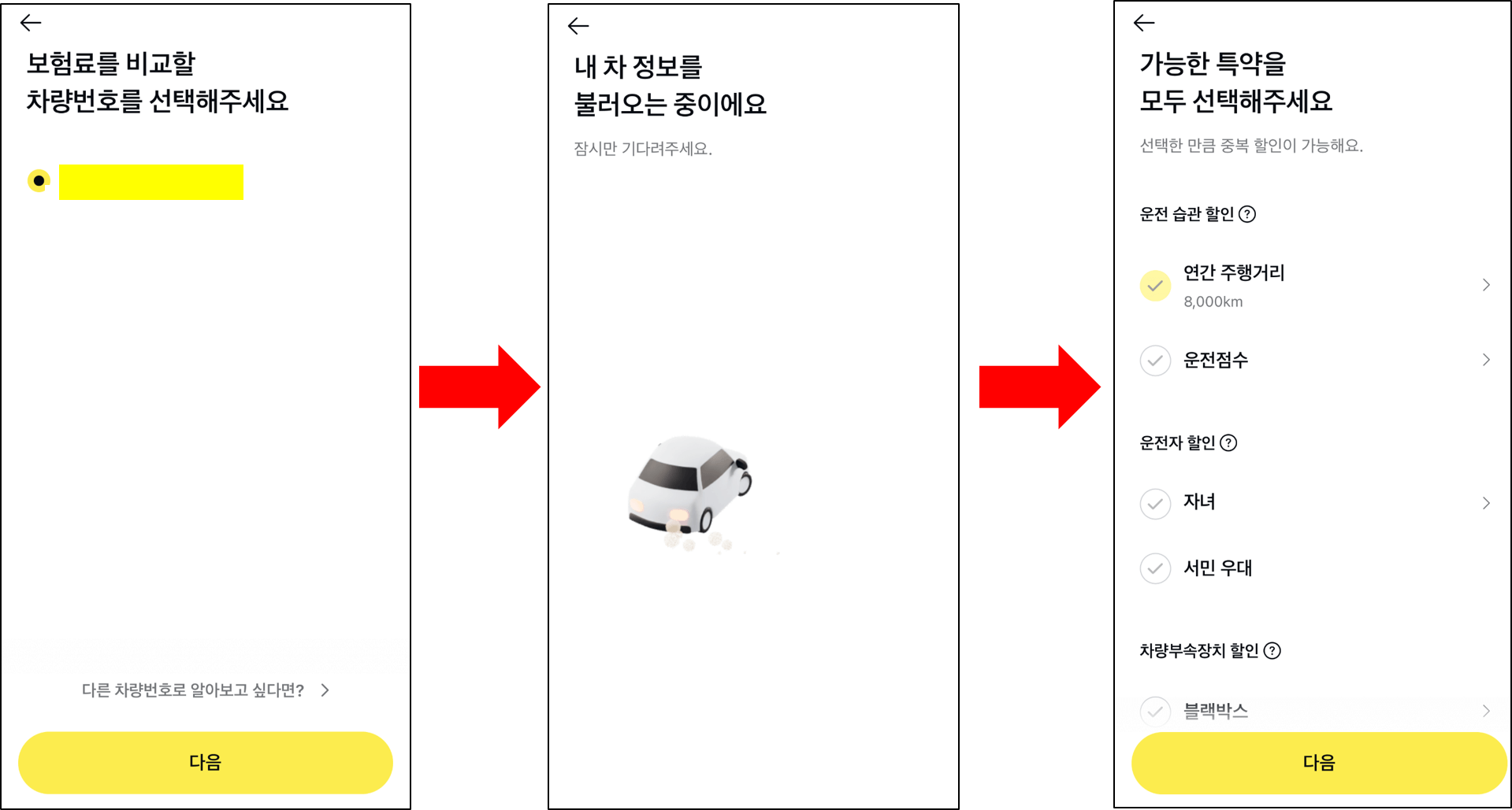 2. 안내 절차에 따라 개인인증을 한 뒤 자동차정보, 가입 정보, 기타 넣고 싶은 특약을 선택한 뒤 비교합니다.