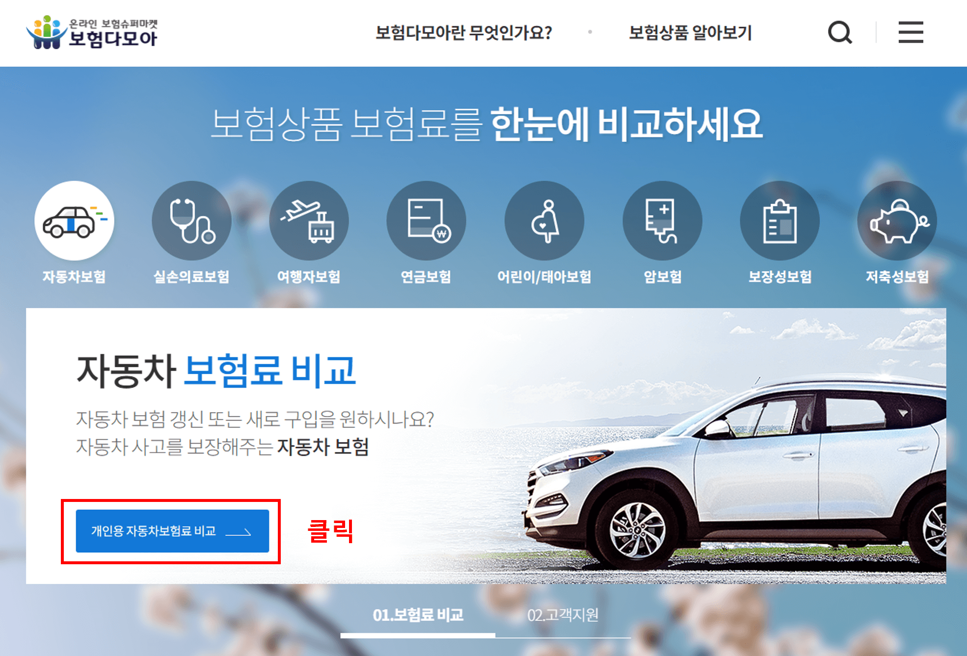 1. 사이트 메인화면에 보이는 개인용 자동차 보험료 비교를 누릅니다.