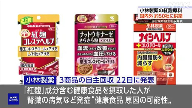 일본 '고바야시 제약'에서 제조·판매한 '붉은누룩(紅麹)' 성분을 포함한 건강식품을 섭취한 사람들에게서 신장병 등이 발생한 것과 관련해 해당 제약회사가 지난 22일 "건강식품이 원인이 됐을 가능성이 있다"고 발표했습니다. 이 성분을 사용한 자사의 건강보조식품 3종류에 대해서는 자발적 리콜 방침도 밝혔습니다. 리콜이 결정된 제품들은 콜레스테롤 감소나 고혈압 개선, 내장지방 감소 등에 효과가 있다고 광고하고 있는 건강보조 식품들입니다. 자발적 리콜이 이뤄지고 있지만, 일본 현지 관광을 가서 드럭스토어 등에서 기념품을 구입할 때 꼼꼼히 살펴볼 필요가 있어 보입니다. 지난 1월 한 달 동안만 일본을 찾은 한국인이 150만 명(전체 외국인의 38%)에 이르는 등 코로나 19 대유행 이후 한국인은 계속해서 일본을 찾는 외국인 방문객 1위를 차지하고 있습니다. 일본 국내에선 식품 제조 업계로 파장이 커지고 있습니다. NHK 방송에 따르면 '고바야시 제약'이 제조·판매하는 '붉은누룩'은 연간 약 18.5톤이며 그 중 80% 가량은 음료와 식품 제조 업체 등 국내외 약 50개 사로 공급되고 있습니다. 공급 받은 업체 중 일부는 자발적 리콜 방침을 밝혔습니다. 문제의 성분이 포함된 제품은 건강보조식품을 비롯해 과자와 오징어 젓갈, 니혼슈(일본술) 등 다양합니다. 나고야에 있는 콩과자 전문점인 '마메후쿠'(豆福)는 해당 '붉은 누룩'과 신장병 발병과의 인과 관계가 명확히 밝혀지지는 않았다면서도 이 성분이 들어간 13개 제품을 회수하고 판매 중지를 결정했습니다. 고바야시 제약은 소비자들에게 기존에 구입한 제품 중에 '붉은누룩' 성분이 포함된 제품은 즉시 사용을 중단해달라며 사과했습니다.