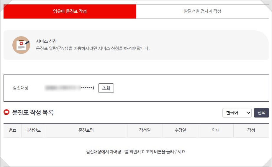"영유아 문진표 작성" 메뉴에서 검진대상 선택 뒤 나오는 문진표를 작성합니다.