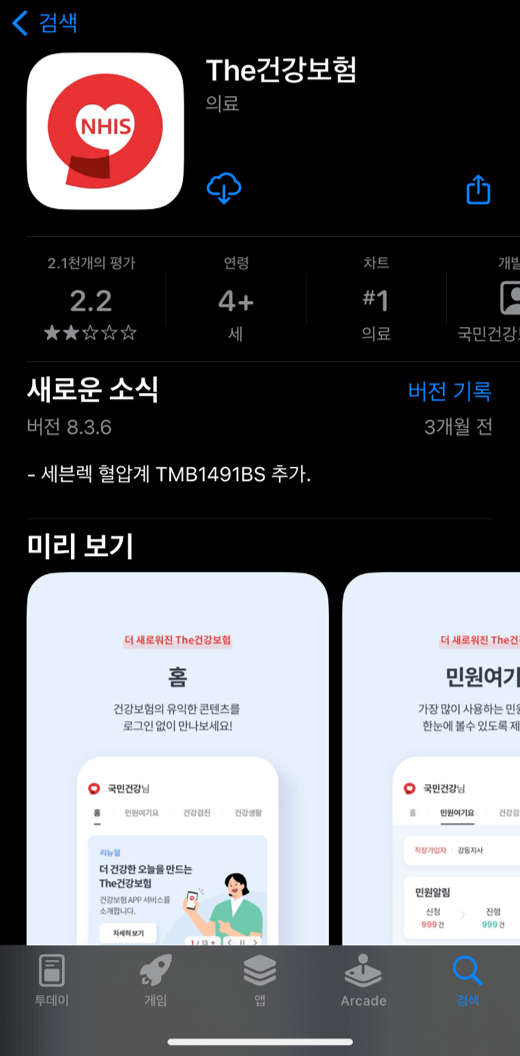 먼저 앱스토어나 구글스토어에서 "The 건강보험" 앱을 다운 받습니다.